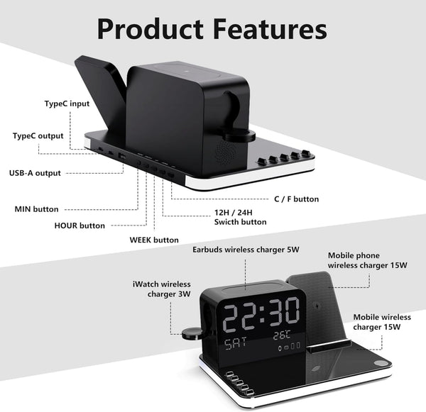 7-in-1 Wireless Charging Station with Clock and Night Light