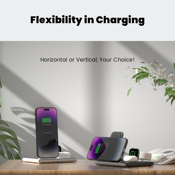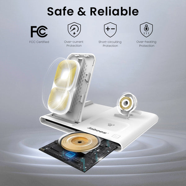 Introducing the Jabees PowerGlow, a versatile 4-in-1 wireless charging station that redefines how you power up your essential devices. With the ability to charge your iPhone, AirPods, Apple Watch, and a range of Qi-enabled gadgets simultaneously, the PowerGlow combines convenience, style, and functionality in a compact and portable design.